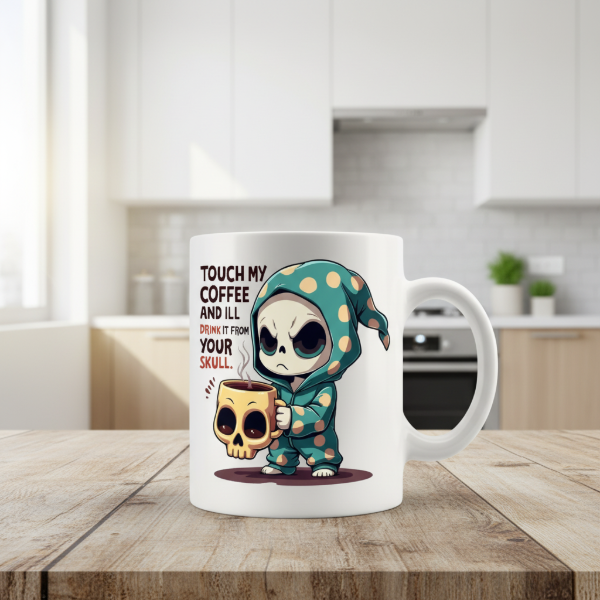 Looking for the perfect novelty coffee mug for the office or a caffeine-obsessed friend? Our “Touch My Coffee And I’ll Drink It From Your Skull” mug is the ultimate statement piece for anyone who takes their morning brew seriously.